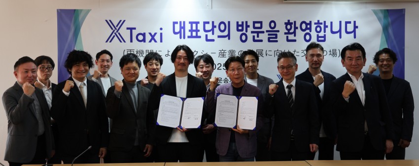 "우리 조합은 일본 크로스택시와 택시산업 발전을 위한 친선 협력 MOU를 체결하였습니다" 2025-04-24 1. 일시 : 2025.4.18.(금) 오후 14시 2. 장소 : 교통회관 6층 조합회의실 3. 참석자 : 크로스택시 대표 외 12명, 김동영 박사, 티머니 윤존이 팀장, 김태훈 부이사장, 문창식 대표이사, 심상홍 대표이사, 임상원 대표이사, 이우영 대표이사, 전승훈 대표이사, 최바다 대표이사